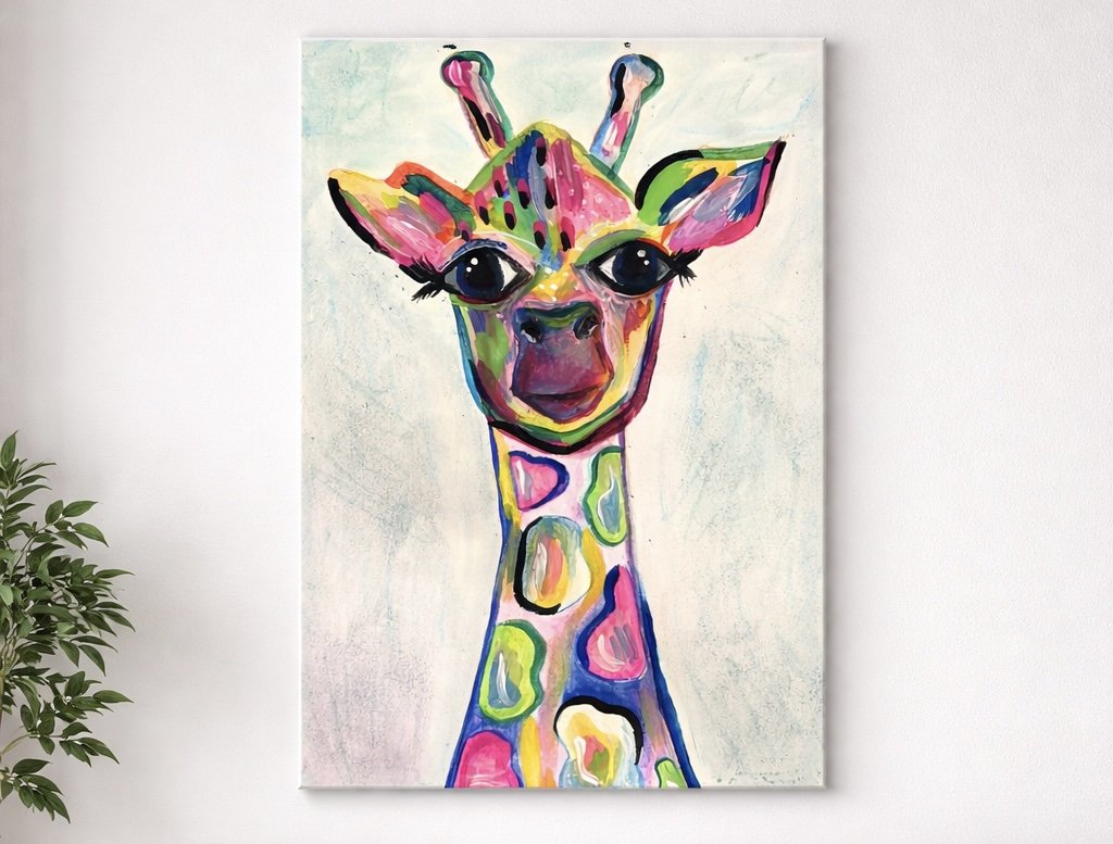 Wir malen eine farbenfrohe Giraffe auf eine Leinwand.